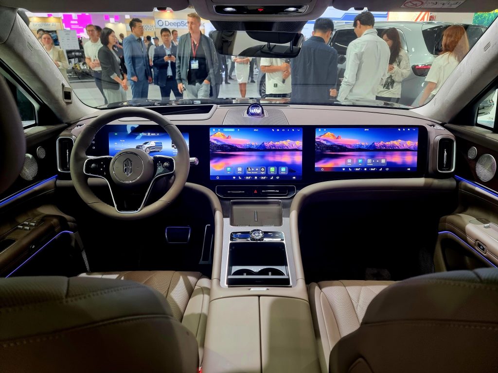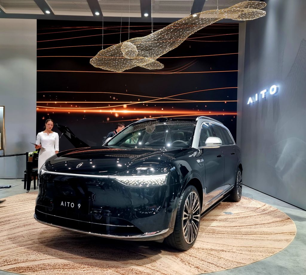 Und im Schlachtschiff 9 beispielsweise drei Touchscreens über die ganze Breite des Armaturenbretts, für die Rücksitze eine ausfahrbare Leinwand für Filmerlebnisse oder Videospiele, automatisch ausfahrende Trittbretter und vollautonome Fahrfunktionen, für die Aito und seine Software-Partner schon mehrere Billionen Kilometer Fahrdaten gesammelt haben, so Manager Kang.