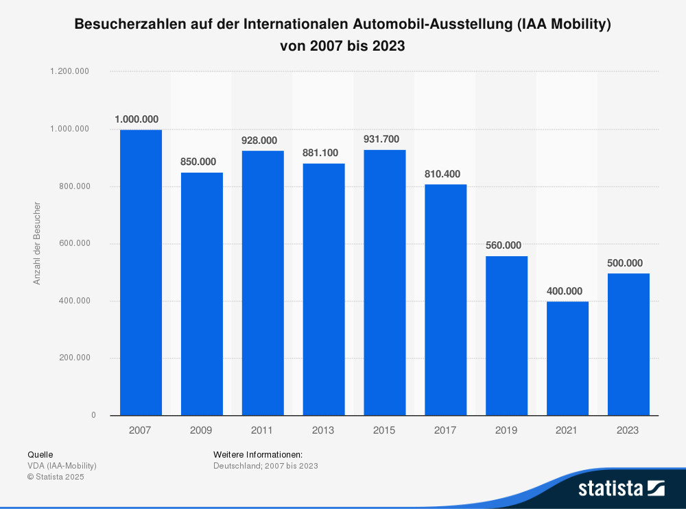 Das Niveau der Vor-Corona-Zeit bleibt fern, aber zuletzt ging es zumindest wieder hoch mit den IAA-Besucherzahlen. Bei der bislang letzten Auflage im Herbst 2023 zählten die Organisatoren 500.000 Gäste, wie sich aus einer Statista-Grafik auf Basis von Zahlen des Branchenverbands VDA ergibt. Das waren 100.000 mehr als bei der ersten Show in München im Jahr 2021.
